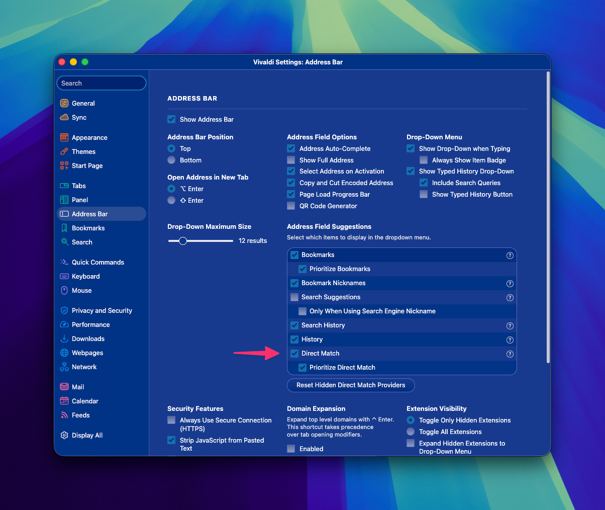 Disable Direct Match. This one took me a while to figure out. There’s a feature called “Direct Match” that hijacks your address bar and inserts referral links into your dropdown suggestions, prioritizing them over your actual history and bookmarks. It’s not a bookmark you can delete, it’s baked into the browser.
